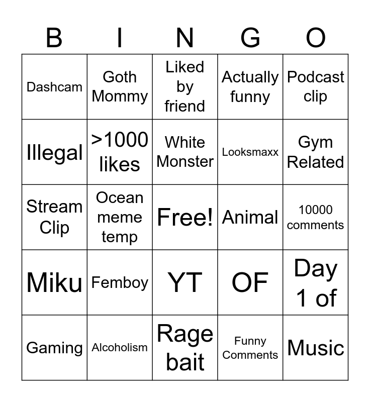 This bingo card has a free space and 24 words: Femboy, Alcoholism, White Monster, Gaming, Podcast clip, Dashcam, Illegal, Goth Mommy, Animal, YT, Looksmaxx, Stream Clip, OF, Day 1 of, >1000 likes, Funny Comments, 10000 comments, Liked by friend, Gym Related, Ocean meme temp, Music, Miku, Actually funny and Rage bait.