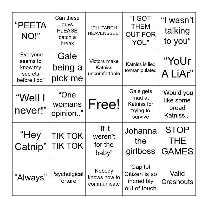 This bingo card has a free space and 26 words: “If it weren’t for the baby”, Capitol Citizen is so incredibly out of touch, Victors make Katniss uncomfortable, Psycholgical Torture, “I wasn’t talking to you”, “PEETA NO!”, “Everyone seems to know my secrets before I do”, Can these guys PLEASE catch a break, “Would you like some bread Katniss..”, Johanna the girlboss, Katniss is lied to/manipulated, “Well I never!”, STOP THE GAMES, “Always”, “One womans opinion..”, BETRAYAL, “I GOT THEM OUT FOR YOU”, “Hey Catnip”, “PLUTARCH HEAVENSBEE”, Valid Crashouts, “YoUr A LiAr”, Nobody knows how to communicate, Gale gets mad at Katniss for trying to survive, TIK TOK TIK TOK, Gale being a pick me and Peeta :(.