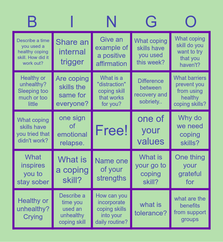 This bingo card has a free space and 24 words: Healthy or unhealthy? Crying, What is a coping skill?, What is a "distraction" coping skill that works for you?, what is tolerance?, What coping skill do you want to try that you haven't?, Describe a time you used a healthy coping skill. How did it work out?, Share an internal trigger, Give an example of a positive affirmation, one of your values, Why do we need coping skills?, What coping skills have you tried that didn't work?, Are coping skills the same for everyone?, What is your go to coping skill?, One thing your grateful for, Healthy or unhealthy? Sleeping too much or too little, Describe a time you used an unhealthy coping skill, How can you incorporate coping skills into your daily routine?, What coping skills have you used this week?, What barriers prevent you from using healthy coping skills?, What inspires you to stay sober, one sign of emotional relapse., Name one of your strengths, Difference between recovery and sobriety.. and what are the benefits from support groups.