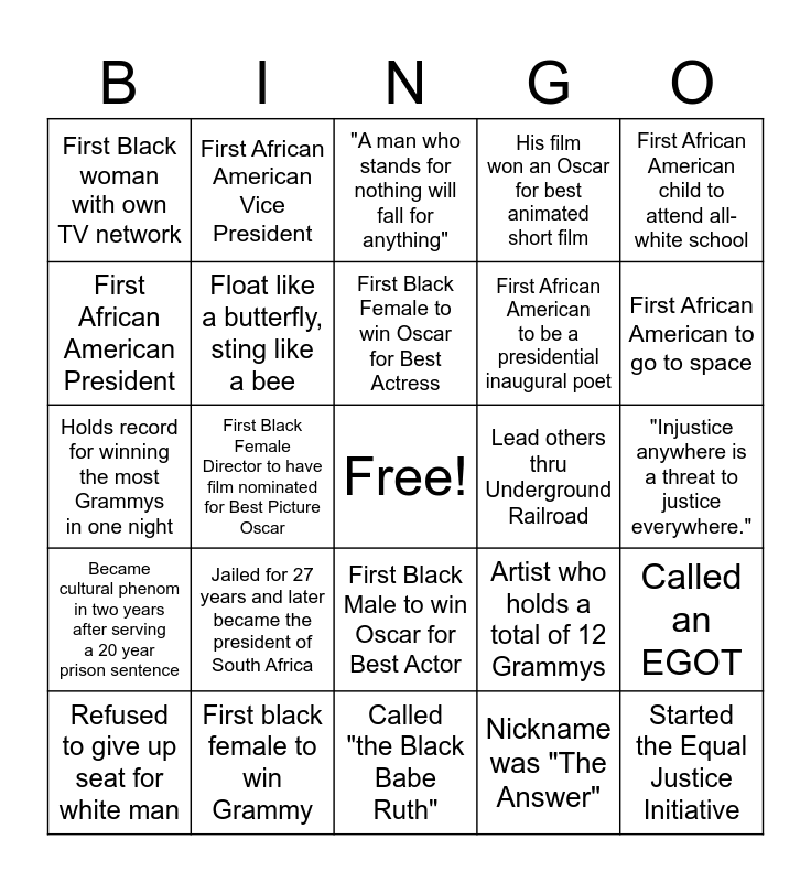 This bingo card has a free space and 24 words: Jailed for 27 years and later became the president of South Africa, First black female to win Grammy, First Black Female to win Oscar for Best Actress, Refused to give up seat for white man, First African American child to attend all-white school, First Black woman with own TV network, First African American President, First African American Vice President, Lead others thru Underground Railroad, First Black Male to win Oscar for Best Actor, First African American to be a presidential inaugural poet, Holds record for winning the most Grammys in one night, Artist who holds a total of 12 Grammys, Called an EGOT, Float like a butterfly, sting like a bee, Nickname was "The Answer", "Injustice anywhere is a threat to justice everywhere.", "A man who stands for nothing will fall for anything", First African American to go to space, First Black Female Director to have film nominated for Best Picture Oscar, Started the Equal Justice Initiative, Became cultural phenom in two years after serving a 20 year prison sentence, His film won an Oscar for best animated short film and Called "the Black Babe Ruth".