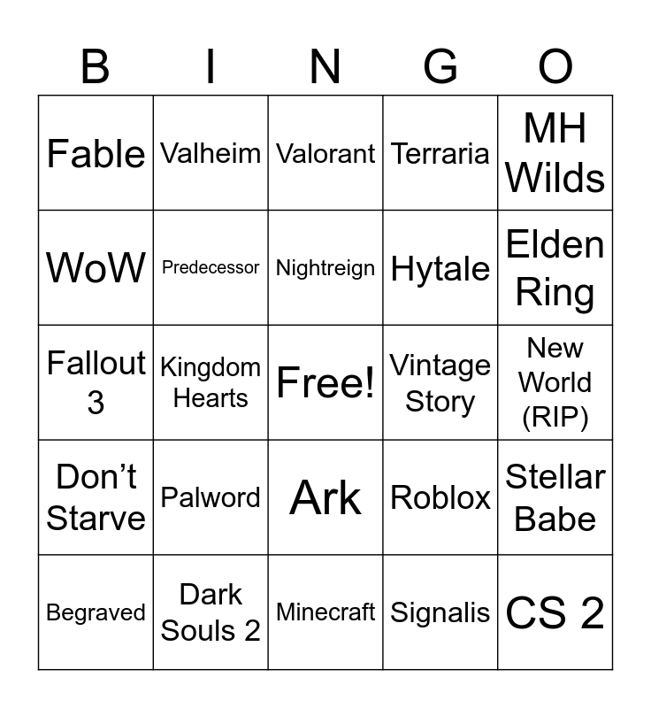 This bingo card has a free space and 24 words: Palword, Dark Souls 2, Nightreign, Begraved, MH Wilds, Fable, WoW, Valheim, Vintage Story, Ark, Hytale, Fallout 3, Roblox, Stellar Babe, Predecessor, Signalis, New World (RIP), Valorant, Elden Ring, Kingdom Hearts, CS 2, Don’t Starve, Terraria and Minecraft.