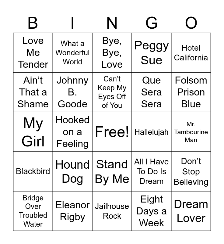 This bingo card has a free space and 26 words: Stand By Me, Eight Days a Week, Can’t Keep My Eyes Off of You, Eleanor Rigby, Hotel California, Love Me Tender, Ain’t That a Shame, What a Wonderful World, Mr. Tambourine Man, All I Have To Do Is Dream, Que Sera Sera, My Girl, Don’t Stop Believing, Bridge Over Troubled Water, Hooked on a Feeling, Imagine, Peggy Sue, Blackbird, Bye, Bye, Love, Dream Lover, Folsom Prison Blue, Jailhouse Rock, Hallelujah, Hound Dog, Johnny B. Goode and I Walk The Line.