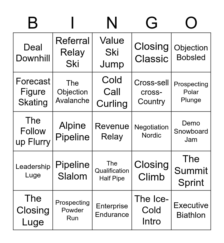This bingo card has a free space and 24 words: Pipeline Slalom, Prospecting Powder Run, Cold Call Curling, The Closing Luge, Objection Bobsled, Deal Downhill, Forecast Figure Skating, Referral Relay Ski, Negotiation Nordic, The Qualification Half Pipe, Cross-sell cross-Country, The Follow up Flurry, Closing Climb, The Summit Sprint, The Objection Avalanche, The Ice-Cold Intro, Demo Snowboard Jam, Value Ski Jump, Prospecting Polar Plunge, Alpine Pipeline, Executive Biathlon, Leadership Luge, Closing Classic and Enterprise Endurance.