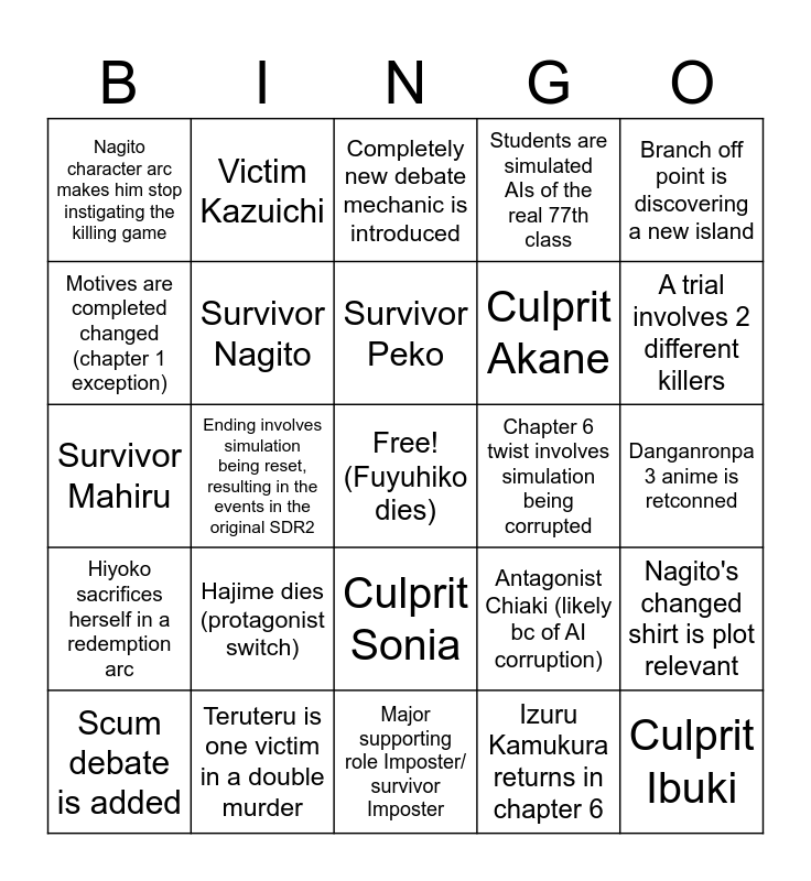 This bingo card has a free space and 24 words: Hajime dies (protagonist switch), Teruteru is one victim in a double murder, Survivor Peko, Scum debate is added, Branch off point is discovering a new island, Nagito character arc makes him stop instigating the killing game, Motives are completed changed (chapter 1 exception), Victim Kazuichi, Chapter 6 twist involves simulation being corrupted, Culprit Sonia, Culprit Akane, Survivor Mahiru, Antagonist Chiaki (likely bc of AI corruption), Nagito's changed shirt is plot relevant, Survivor Nagito, Izuru Kamukura returns in chapter 6, Danganronpa 3 anime is retconned, Completely new debate mechanic is introduced, A trial involves 2 different killers, Ending involves simulation being reset, resulting in the events in the original SDR2, Culprit Ibuki, Hiyoko sacrifices herself in a redemption arc, Students are simulated AIs of the real 77th class and Major supporting role Imposter/ survivor Imposter.