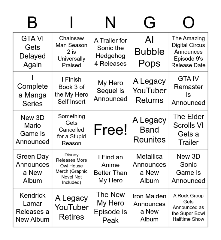 This bingo card has a free space and 24 words: Disney Releases More Owl House Merch (Graphic Novel Not Included), A Legacy YouTuber Retires, My Hero Sequel is Announced, Kendrick Lamar Releases a New Album, The Amazing Digital Circus Announces Episode 9's Release Date, GTA VI Gets Delayed Again, I Complete a Manga Series, Chainsaw Man Season 2 is Universally Praised, A Legacy Band Reunites, I Find an Anime Better Than My Hero, A Legacy YouTuber Returns, New 3D Mario Game is Announced, Metallica Announces a New Album, New 3D Sonic Game is Announced, I Finish Book 3 of the My Hero Self Insert, Iron Maiden Announces a New Album, The Elder Scrolls VI Gets a Trailer, A Trailer for Sonic the Hedgehog 4 Releases, GTA IV Remaster is Announced, Something Gets Cancelled for a Stupid Reason, A Rock Group Gets Announced as the Super Bowl Halftime Show, Green Day Announces a New Album, AI Bubble Pops and The New My Hero Episode is Peak.