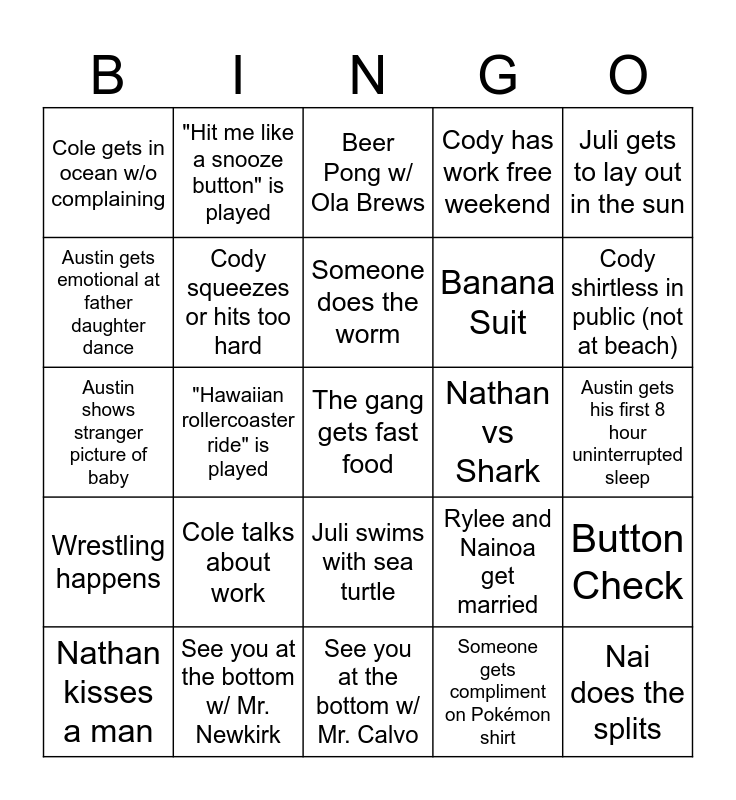 This bingo card has 25 words: Cole talks about work, See you at the bottom w/ Mr. Calvo, Someone does the worm, Nathan kisses a man, Juli gets to lay out in the sun, Cole gets in ocean w/o complaining, Austin gets emotional at father daughter dance, "Hit me like a snooze button" is played, Nathan vs Shark, Juli swims with sea turtle, Banana Suit, Austin shows stranger picture of baby, Rylee and Nainoa get married, Button Check, Cody squeezes or hits too hard, Nai does the splits, Austin gets his first 8 hour uninterrupted sleep, Beer Pong w/ Ola Brews, Cody shirtless in public (not at beach), "Hawaiian rollercoaster ride" is played, The gang gets fast food, See you at the bottom w/ Mr. Newkirk, Wrestling happens, Cody has work free weekend and Someone gets compliment on Pokémon shirt.