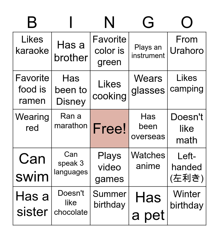 This bingo card has a free space and 29 words: Has a sister, Plays a sport, Ran a marathon, Likes spicy food, Likes karaoke, Favorite color is green, Has been to Disney, Can speak 3 languages, Has been overseas, Doesn't like chocolate, Doesn't like math, Winter birthday, Summer birthday, Has a pet, Likes camping, Doesn't like coffee, Plays video games, Can swim, From Urahoro, Wearing red, Watches anime, Likes reading books, Wears glasses, Favorite food is ramen, Plays an instrument, Has a brother, Left-handed (左利き), Likes cooking and Loves cats.
