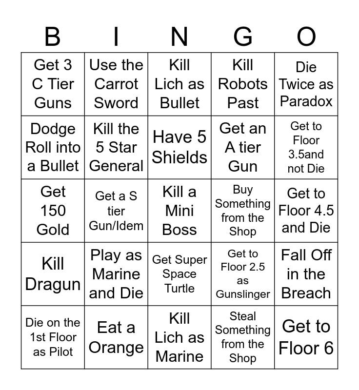 This bingo card has 35 words: Play as Convict and get to Floor 5, Get Junktin, Kill Old King, Kill the 5 Star General, Get Super Space Turtle, Kill Robots Past, Dodge Roll into a Bullet, Have 6 Hearts, Have 5 Shields, Have 10 Blanks, Get 150 Gold, Die Twice as Paradox, Get to Floor 2, Get 3 C Tier Items, Get 3 C Tier Guns, Buy Something from the Shop, Steal Something from the Shop, Get a S tier Gun/Idem, Kill Dragun, Kill a Mini Boss, Get to Floor 2.5 as Gunslinger, Die on the 1st Floor as Pilot, Fall Off in the Breach, Eat a Orange, Kill Lich as Bullet, Get to Floor 3.5and not Die, Get to Floor 6, Get to Floor 1.5 as Paradox, Get an A tier Gun, Get to Floor 4.5 and Die, Play Gungeon for 2 Seconds, Kill Lich as Marine, Play as Marine and Die, Use the Carrot Sword and Get the Makeshift Cannon.