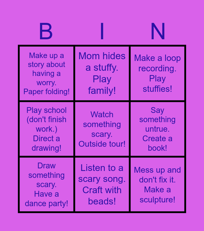 This bingo card has 9 words: Draw something scary. Have a dance party!, Make a loop recording. Play stuffies!, Mom hides a stuffy. Play family!, Play school (don't finish work.) Direct a drawing!, Make up a story about having a worry. Paper folding!, Say something untrue. Create a book!, Watch something scary. Outside tour!, Mess up and don't fix it. Make a sculpture! and Listen to a scary song. Craft with beads!.