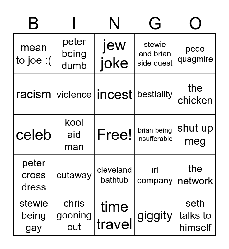 This bingo card has a free space and 24 words: cutaway, chris gooning out, incest, stewie being gay, pedo quagmire, mean to joe :(, racism, peter being dumb, brian being insufferable, cleveland bathtub, bestiality, celeb, irl company, the network, violence, giggity, shut up meg, jew joke, the chicken, kool aid man, seth talks to himself, peter cross dress, stewie and brian side quest and time travel.