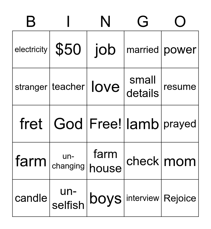 This bingo card has a free space and 24 words: un-changing, un-selfish, love, candle, power, electricity, stranger, $50, lamb, farm house, small details, fret, check, mom, teacher, interview, prayed, job, resume, God, Rejoice, farm, married and boys.