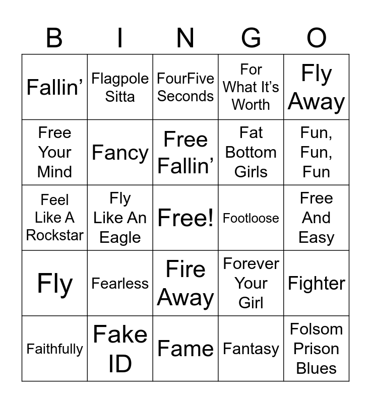 This bingo card has a free space and 57 words: Faith, Faithfully, Fall To Pieces, Fallin’, Fame, Family Affair, Fancy, Fortunate Son, Fat Bottom Girls, Fast Car, For What It’s Worth, Feel So Close, Felt Good On My Lips, Fire And Rain, Fireflies, Float On, Fly Away, Fly Like An Eagle, Follow You Down, Folsom Prison Blues, Footloose, Forever Young, Forever Your Girl, FourFive Seconds, Free, Free Fallin’, Free Bird, Freeway Of Love, Fun, Fun, Fun, Funky Town, Funky Cold Medina, Family Tradition, Flashdance, Forever and Ever, Amen, Free And Easy, Free Your Mind, Fast Cars And Freedom, Feel Like A Rockstar, Fly Me To The Moon, Fly, Flagpole Sitta, Fire Away, Flowers, Fergalicious, Fireball, Fishing In The Dark, Fearless, Fake ID, Forever, Firework, Follow Me, Fantasy, Foolish, Famous Friends, Fancy Like, Fighter and Fifth Of May.