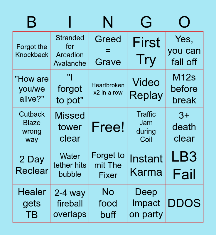 This bingo card has a free space and 24 words: Healer gets TB, Water tether hits bubble, Heartbroken x2 in a row, Deep Impact on party, Yes, you can fall off, Forgot the Knockback, Stranded for Arcadion Avalanche, Greed = Grave, Traffic Jam during Coil, 3+ death clear, Cutback Blaze wrong way, "I forgot to pot", Instant Karma, LB3 Fail, "How are you/we alive?", 2-4 way fireball overlaps, No food buff, First Try, M12s before break, 2 Day Reclear, Missed tower clear, Forget to mit The Fixer, Video Replay and DDOS.