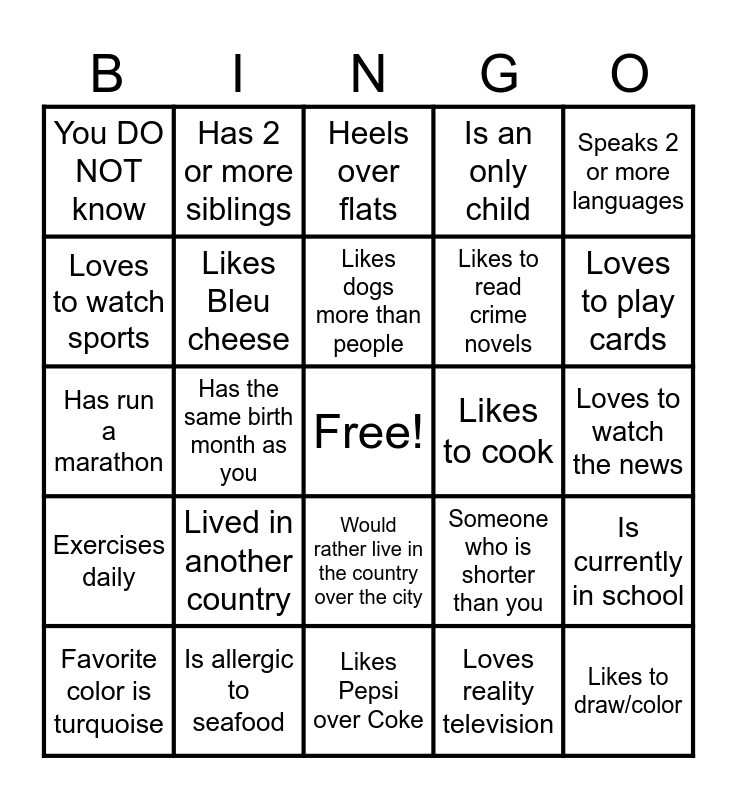 This bingo card has a free space and 25 words: Lived in another country, Likes Pepsi over Coke, Likes dogs more than people, Favorite color is turquoise, Speaks 2 or more languages, You DO NOT know, Loves to watch sports, Has 2 or more siblings, Likes to cook, Would rather live in the country over the city, Likes to read crime novels, Has run a marathon, Someone who is shorter than you, Is currently in school, Likes Bleu cheese, Is the oldest, Loves to watch the news, Heels over flats, Loves to play cards, Has the same birth month as you, Likes to draw/color, Is allergic to seafood, Exercises daily, Is an only child and Loves reality television.