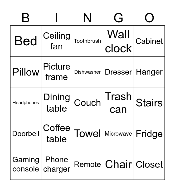 This bingo card has 50 words: Free!, Couch, TV, Remote, Coffee table, Lamp, Ceiling fan, Blanket, Pillow, Rug, Picture frame, Wall clock, Fridge, Microwave, Oven, Sink, Dishwasher, Trash can, Pantry, Cabinet, Dining table, Chair, Bed, Dresser, Mirror, Closet, Hanger, Laundry basket, Toothbrush, Towel, Shower, Toilet, Doormat, Light switch, Phone charger, Wi-Fi router, Backpack, Shoes, Keys, Stairs, Window, Curtains, Bookshelf, Notebook, Gaming console, Headphones, Water bottle, House plant, Doorbell and Smoke detector.