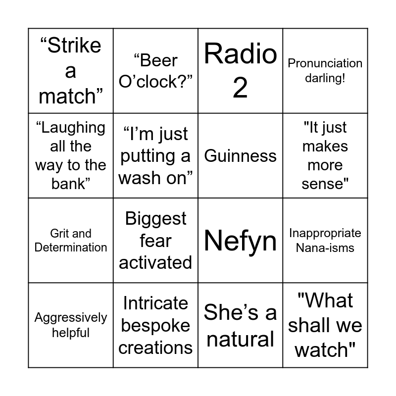This bingo card has 24 words: Knuckles, "Just nipping to the shop", "It just makes more sense", “I’ll need to fiddle with it", “Laughing all the way to the bank”, “Strike a match”, “I’m just putting a wash on”, “Beer O’clock?”, Intricate bespoke creations, “Do I look like I’m wearing my daughter’s trousers?”, Grit and Determination, Nefyn, “WAIT!”, “At least to rule it out”, Guinness, Tell-tale laugh, She’s a natural, Radio 2, Biggest fear activated, Inappropriate Nana-isms, Aggressively helpful, "What shall we watch", Pronunciation darling! and “So long, farewell”.