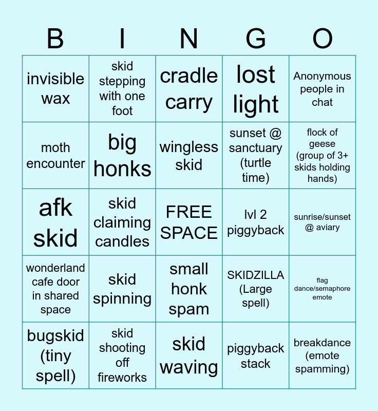 This bingo card has a free space and 35 words: moth needs guide, game crashed, server split, big honks, small honk spam, lost light, moth encounter, musician playing, wingless skid, skid in shared space, afk skid, Anonymous people in chat, skid chilling with a prop, no bench candle, invisible wax, lvl 2 piggyback, piggyback stack, skid claiming candles, wonderland cafe door in shared space, breakdance (emote spamming), SKIDZILLA (Large spell), bugskid (tiny spell), flag dance/semaphore emote, skid shooting off fireworks, cradle carry, flock of geese (group of 3+ skids holding hands), skid on a mount (broom/lighthorn), get turned around when entering door/portal, sunset @ sanctuary (turtle time), sunrise/sunset @ aviary, skid lvl 2 bowing, skid waving, skid spinning, skid stepping with one foot and skid dancing.
