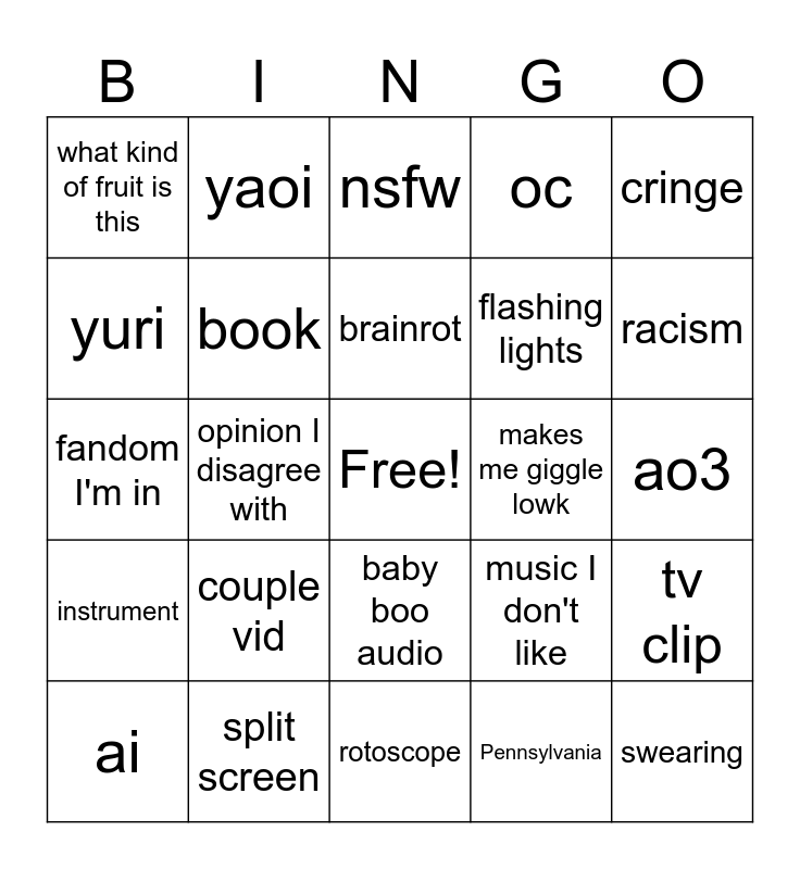This bingo card has a free space and 24 words: couple vid, split screen, brainrot, ai, cringe, what kind of fruit is this, yuri, yaoi, makes me giggle lowk, baby boo audio, flashing lights, fandom I'm in, music I don't like, tv clip, book, Pennsylvania, ao3, nsfw, racism, opinion I disagree with, swearing, instrument, oc and rotoscope.