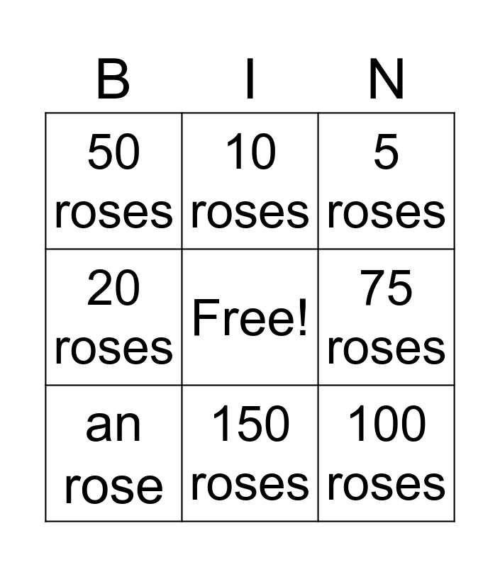 This bingo card has a free space and 9 words: an rose, 5 roses, 10 roses, 20 roses, 50 roses, 75 roses, 100 roses, 120 roses and 150 roses.