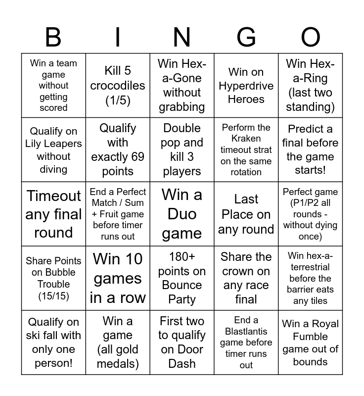 This bingo card has a free space and 24 words: Win 10 games in a row, Win a game (all gold medals), Double pop and kill 3 players, Qualify on ski fall with only one person!, Win Hex-a-Ring (last two standing), Win a team game without getting scored, Qualify on Lily Leapers without diving, Kill 5 crocodiles (1/5), Last Place on any round, 180+ points on Bounce Party, Perform the Kraken timeout strat on the same rotation, Timeout any final round, Share the crown on any race final, Win hex-a-terrestrial before the barrier eats any tiles, Qualify with exactly 69 points, End a Blastlantis game before timer runs out, Perfect game (P1/P2 all rounds - without dying once), Win Hex-a-Gone without grabbing, Predict a final before the game starts!, End a Perfect Match / Sum + Fruit game before timer runs out, Win a Royal Fumble game out of bounds, Share Points on Bubble Trouble (15/15), Win on Hyperdrive Heroes and First two to qualify on Door Dash.