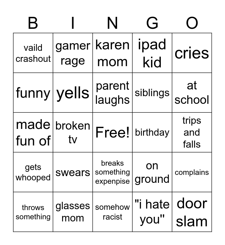 This bingo card has a free space and 24 words: swears, glasses mom, parent laughs, throws something, cries, vaild crashout, funny, gamer rage, birthday, breaks something expenpise, siblings, made fun of, on ground, complains, yells, "i hate you'', trips and falls, karen mom, at school, broken tv, door slam, gets whooped, ipad kid and somehow racist.