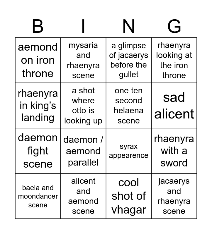 This bingo card has 16 words: alicent and aemond scene, rhaenyra with a sword, a glimpse of jacaerys before the gullet, aemond on iron throne, daemon fight scene, mysaria and rhaenyra scene, syrax appearence, cool shot of vhagar, rhaenyra in king’s landing, a shot where otto is looking up, baela and moondancer scene, rhaenyra looking at the iron throne, daemon / aemond parallel, sad alicent, one ten second helaena scene and jacaerys and rhaenyra scene.