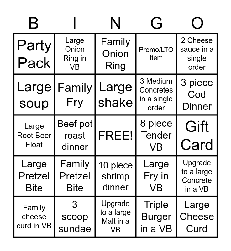 This bingo card has a free space and 24 words: Family Pretzel Bite, 3 scoop sundae, Large shake, Family cheese curd in VB, 2 Cheese sauce in a single order, Party Pack, Large soup, Large Onion Ring in VB, 8 piece Tender VB, 10 piece shrimp dinner, 3 Medium Concretes in a single order, Large Root Beer Float, Large Fry in VB, Upgrade to a large Concrete in a VB, Family Fry, Triple Burger in a VB, Gift Card, Family Onion Ring, 3 piece Cod Dinner, Beef pot roast dinner, Large Cheese Curd, Large Pretzel Bite, Promo/LTO Item and Upgrade to a large Malt in a VB.