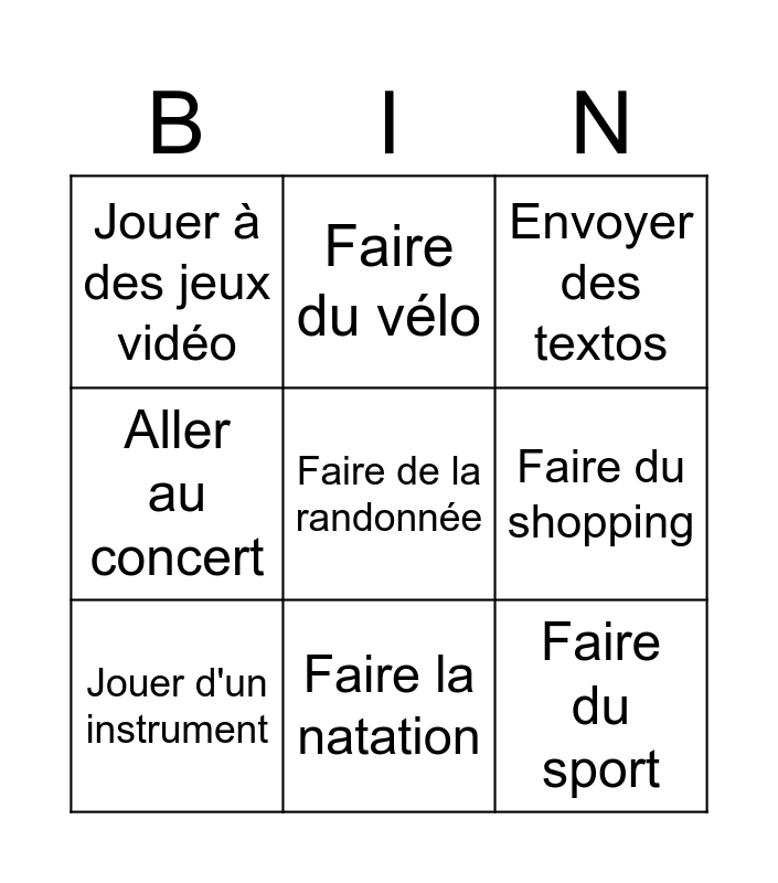 This bingo card has a free space and 8 words: Faire du shopping, Envoyer des textos, Faire du vélo, Jouer d'un instrument, Jouer à des jeux vidéo, Faire du sport, Aller au concert and Faire la natation.
