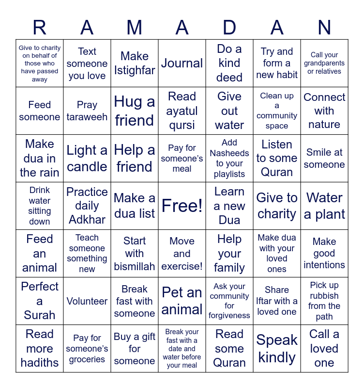 This bingo card has a free space and 49 words: Share Iftar with a loved one, Clean up a community space, Read some Quran, Practice daily Adkhar, Help a friend, Water a plant, Text someone you love, Buy a gift for someone, Try and form a new habit, Move and exercise!, Call your grandparents or relatives, Journal, Listen to some Quran, Add Nasheeds to your playlists, Volunteer, Give to charity, Feed someone, Connect with nature, Pick up rubbish from the path, Do a kind deed, Give out water, Make a dua list, Give to charity on behalf of those who have passed away, Pray taraweeh, Read more hadiths, Hug a friend, Smile at someone, Pay for someone’s groceries, Pay for someone’s meal, Light a candle, Clean your home, Learn a new Dua, Perfect a Surah, Break fast with someone, Drink water sitting down, Help your family, Make dua with your loved ones, Make good intentions, Make dua in the rain, Start with bismillah, Pet an animal, Feed an animal, Call a loved one, Break your fast with a date and water before your meal, Read ayatul qursi, Make Istighfar, Ask your community for forgiveness, Teach someone something new and Speak kindly.