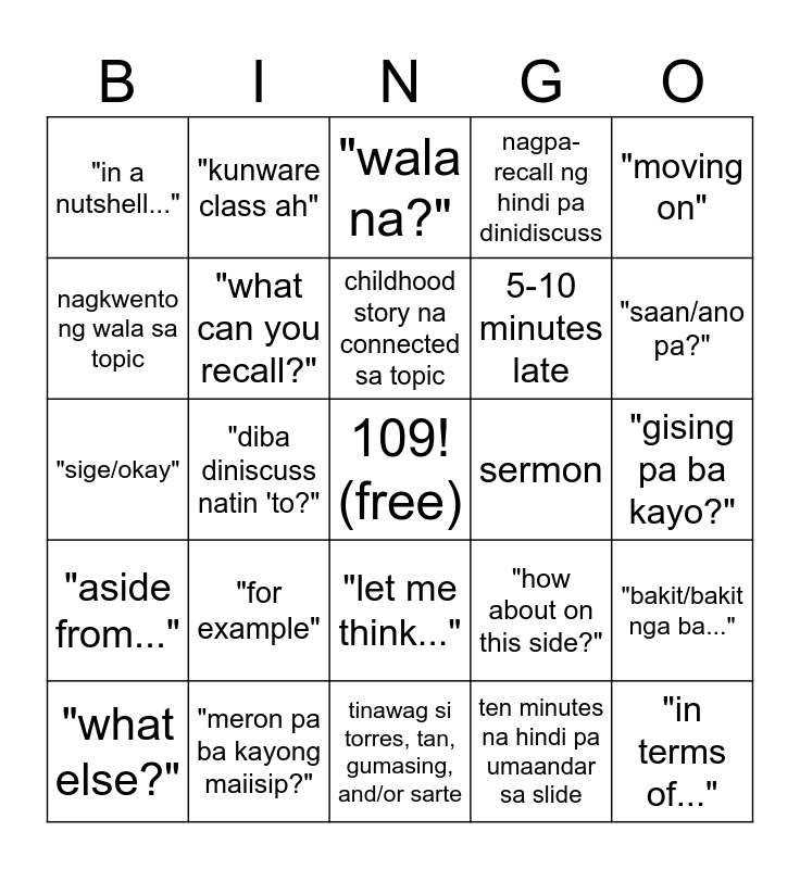 This bingo card has a free space and 24 words: "for example", "meron pa ba kayong maiisip?", childhood story na connected sa topic, "what else?", "moving on", "in a nutshell...", nagkwento ng wala sa topic, "kunware class ah", sermon, "let me think...", 5-10 minutes late, "sige/okay", "how about on this side?", "bakit/bakit nga ba...", "what can you recall?", ten minutes na hindi pa umaandar sa slide, "gising pa ba kayo?", "wala na?", "saan/ano pa?", "diba diniscuss natin 'to?", "in terms of...", "aside from...", nagpa-recall ng hindi pa dinidiscuss and tinawag si torres, tan, gumasing, and/or sarte.
