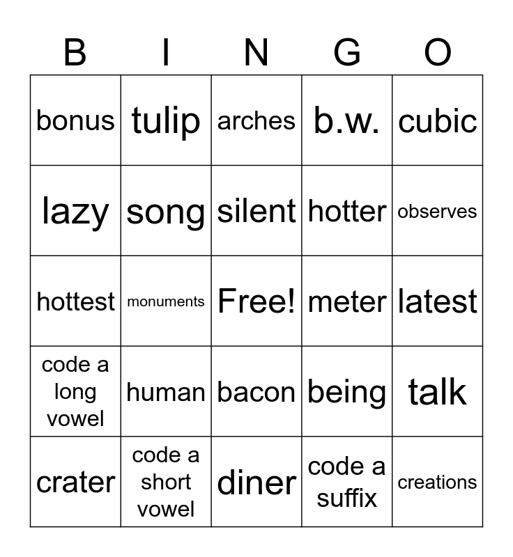 This bingo card has a free space and 25 words: human, diner, silent, crater, cubic, bonus, lazy, tulip, meter, bacon, hotter, hottest, being, talk, song, later, latest, arches, observes, monuments, creations, code a short vowel, code a long vowel, b.w. and code a suffix.