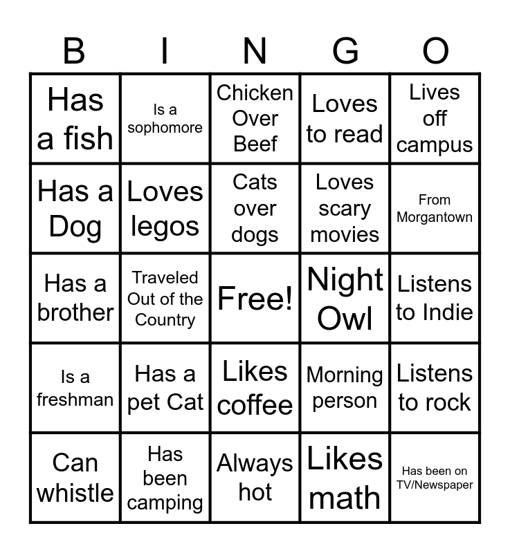 This bingo card has a free space and 88 words: Likes Sushi, Loves to hike, Likes coffee, Can sing, Eye color is brown, Eye color is blue, Eye color is green, Eye color is hazel, Eye color is grey, Likes to dance, Is wearing jeans, Listens to pop, Listens to rock, Listens to Indie, Listens to Rock, Cats over dogs, Likes Ice cream, Favorite color is pink, Favorite color is green, Favorite color is blue, Favorite color is purple, Favorite color is red, Has a brother, Has a sister, Likes math, Most tattoos, Most piercings, Left handed, Has lived in more states, Longest hair, Chicken Over Beef, Loves to read, Is the tallest, Is the shortest, Has a pet Cat, Has a Dog, Has a fish, Bilingual, From WV, From Morgantown, Traveled Out of the Country, Can't Swim, Volunteers, Morning person, Night Owl, Likes board games, Likes Crafts, Likes Matcha, Plays Club Sports, Loves scary movies, Hates scary movies, Is a good cook, Loves reality TV, Sweet Over Salty, Only Child, Broken a bone, Is a freshman, Is a sophomore, Is a junior, Is a senior, Is in STEM, Dyed Hair, Double Major, Loves to shop, Is wearing pink, Has been camping, Loves the Beach, Loves legos, Can whistle, Has been on TV/Newspaper, Always early, Always late, Lives on campus, Lives off campus, Introvert, Extrovert, Oldest sibling, Always cold, Always hot, Very competitive, Indecisive, Summer birthday, Winter birthday, Fall birthday, Spring Birthday, Been to a concert, Has a bucket list and knows the most pi.