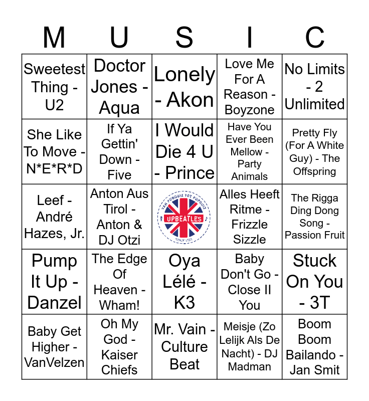 This bingo card has a free space and 24 words: The Edge Of Heaven - Wham!, Oh My God - Kaiser Chiefs, I Would Die 4 U - Prince, Baby Get Higher - VanVelzen, No Limits - 2 Unlimited, Sweetest Thing - U2, She Like To Move - N*E*R*D, Doctor Jones - Aqua, Alles Heeft Ritme - Frizzle Sizzle, Oya Lélé - K3, Have You Ever Been Mellow - Party Animals, Leef - André Hazes, Jr., Baby Don't Go - Close II You, Stuck On You - 3T, If Ya Gettin' Down - Five, Meisje (Zo Lelijk Als De Nacht) - DJ Madman, The Rigga Ding Dong Song - Passion Fruit, Lonely - Akon, Pretty Fly (For A White Guy) - The Offspring, Anton Aus Tirol - Anton & DJ Otzi, Boom Boom Bailando - Jan Smit, Pump It Up - Danzel, Love Me For A Reason - Boyzone and Mr. Vain - Culture Beat.
