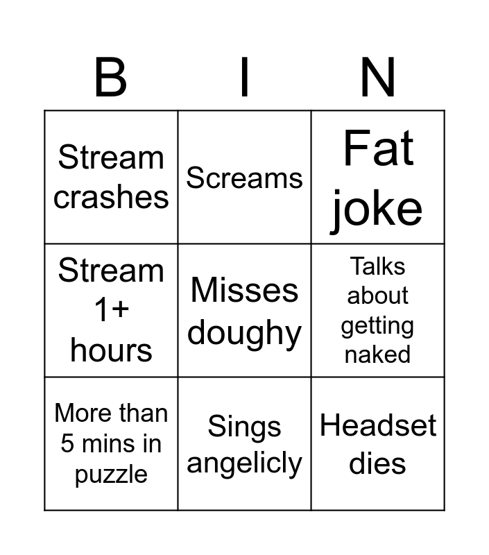 This bingo card has a free space and 8 words: Talks about getting naked, Fat joke, Screams, More than 5 mins in puzzle, Stream crashes, Headset dies, Stream 1+ hours and Sings angelicly.