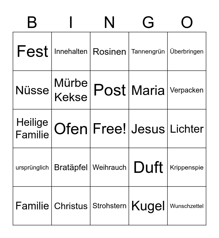 This bingo card has a free space and 24 words: Bratäpfel, Christus, Post, Familie, Überbringen, Fest, Nüsse, Innehalten, Jesus, Weihrauch, Maria, Heilige Familie, Duft, Krippenspie, Mürbe Kekse, Kugel, Lichter, Rosinen, Verpacken, Ofen, Wunschzettel, ursprünglich, Tannengrün and Strohstern.