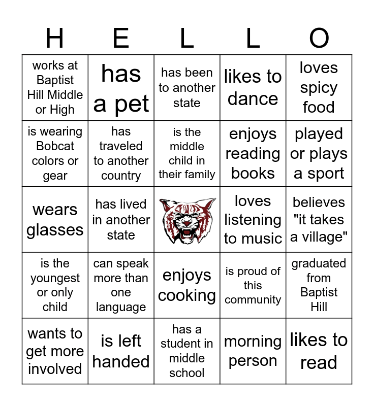 This bingo card has a free space and 28 words: graduated from Baptist Hill, plays an instrument, enjoys reading books, morning person, is wearing Bobcat colors or gear, has been to another state, has a pet, is the youngest or only child, loves listening to music, wants to get more involved, wears glasses, likes to dance, is left handed, has a student in middle school, played or plays a sport, loves social studies or history, can speak more than one language, has traveled to another country, is the middle child in their family, enjoys cooking, works at Baptist Hill Middle or High, has a summer birthday (May, Jun, Jul, Aug), likes to read, has lived in another state, believes "it takes a village", is proud of this community, loves spicy food and is new to the community.
