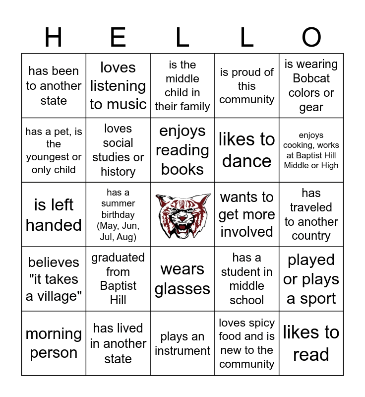 This bingo card has a free space and 25 words: graduated from Baptist Hill, plays an instrument, enjoys reading books, morning person, is wearing Bobcat colors or gear, has been to another state, has a pet, is the youngest or only child, loves listening to music, wants to get more involved, wears glasses, likes to dance, is left handed, has a student in middle school, played or plays a sport, loves social studies or history, can speak more than one language, has traveled to another country, is the middle child in their family, enjoys cooking, works at Baptist Hill Middle or High, has a summer birthday (May, Jun, Jul, Aug), likes to read, has lived in another state, believes "it takes a village", is proud of this community and loves spicy food and is new to the community.