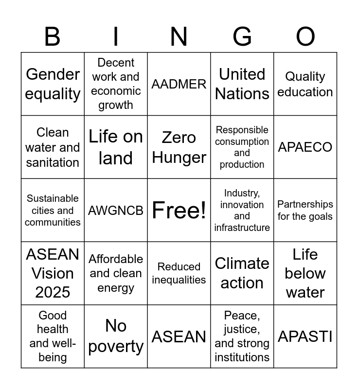 This bingo card has a free space and 24 words: Affordable and clean energy, No poverty, Zero Hunger, Good health and well-being, Quality education, Gender equality, Clean water and sanitation, Decent work and economic growth, Industry, innovation and infrastructure, Reduced inequalities, Responsible consumption and production, Sustainable cities and communities, Climate action, Life below water, Life on land, Peace, justice, and strong institutions, Partnerships for the goals, AADMER, APAECO, AWGNCB, APASTI, ASEAN Vision 2025, United Nations and ASEAN.
