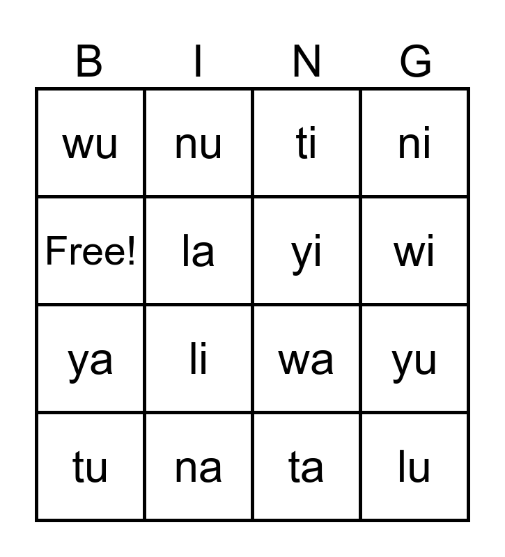 This bingo card has 16 words: na, yu, ti, wu, ya, nu, wa, ta, Free!, la, tu, ni, li, wi, yi and lu.
