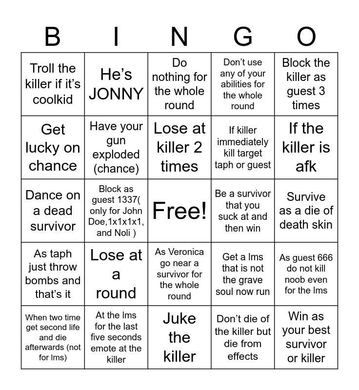 This bingo card has a free space and 24 words: Lose at a round, At the lms for the last five seconds emote at the killer, Lose at killer 2 times, When two time get second life and die afterwards (not for lms), Block the killer as guest 3 times, Troll the killer if it’s coolkid, Get lucky on chance, He’s JONNY, Be a survivor that you suck at and then win, As Veronica go near a survivor for the whole round, If killer immediately kill target taph or guest, Dance on a dead survivor, Get a lms that is not the grave soul now run, As guest 666 do not kill noob even for the lms, Have your gun exploded (chance), Don’t die of the killer but die from effects, Survive as a die of death skin, Do nothing for the whole round, If the killer is afk, Block as guest 1337( only for John Doe,1x1x1x1, and Noli ), Win as your best survivor or killer, As taph just throw bombs and that’s it, Don’t use any of your abilities for the whole round and Juke the killer.