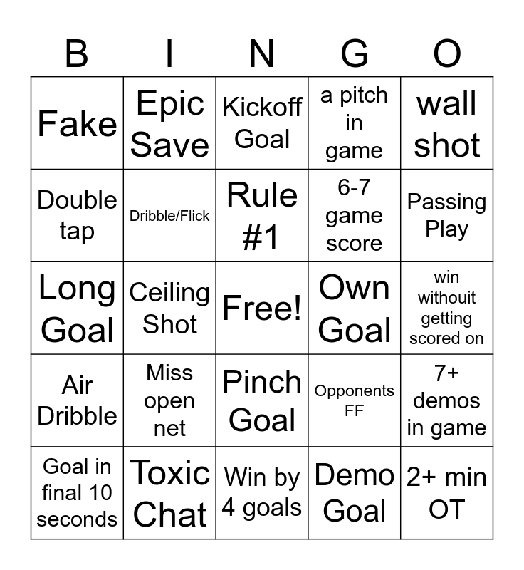 This bingo card has a free space and 24 words: Miss open net, Toxic Chat, Rule #1, Goal in final 10 seconds, wall shot, Fake, Double tap, Epic Save, Own Goal, Pinch Goal, 6-7 game score, Long Goal, Opponents FF, 7+ demos in game, Dribble/Flick, Demo Goal, win withouit getting scored on, Kickoff Goal, Passing Play, Ceiling Shot, 2+ min OT, Air Dribble, a pitch in game and Win by 4 goals.