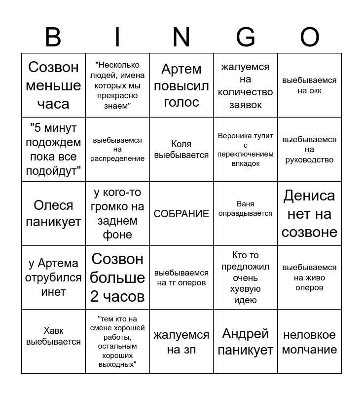 This bingo card has a free space and 24 words: Созвон больше 2 часов, "тем кто на смене хорошей работы, остальным хороших выходных", Коля выебывается, Хавк выебывается, выебываемся на окк, Созвон меньше часа, "5 минут подождем пока все подойдут", "Несколько людей, имена которых мы прекрасно знаем", Ваня оправдывается, выебываемся на тг оперов, Вероника тупит с переключением влкадок, Олеся паникует, Кто то предложил очень хуевую идею, выебываемся на живо оперов, выебываемся на распределение, Андрей паникует, Дениса нет на созвоне, Артем повысил голос, выебываемся на руководство, у кого-то громко на заднем фоне, неловкое молчание, у Артема отрубился инет, жалуемся на количество заявок and жалуемся на зп.