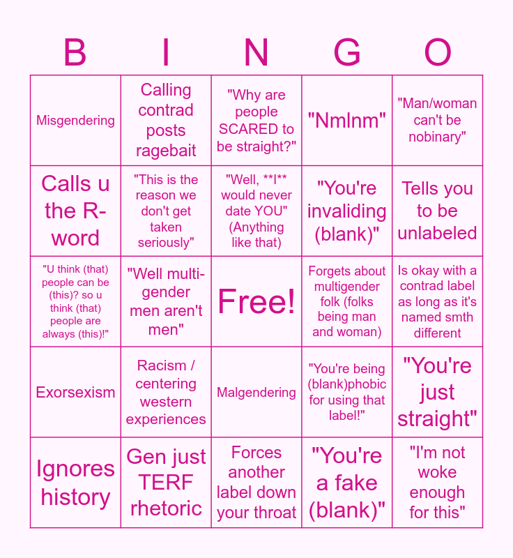 This bingo card has a free space and 28 words: "You're just straight", "Invading", "You're invaliding (blank)", "You're a fake (blank)", Calls u the R-word, "Why are people SCARED to be straight?", Calling contrad posts ragebait, Exorsexism, Forgets about multigender folk (folks being man and woman), Ignores history, "U think (that) people can be (this)? so u think (that) people are always (this)!", "Nmlnm", Gen just TERF rhetoric, Forces another label down your throat, Tells you to be unlabeled, Intersexism, Racism / centering western experiences, "This is the reason we don't get taken seriously", "Well, **I** would never date YOU" (Anything like that), Malgendering, Misgendering, Doesn't understand spilt attraction model., "I'm not woke enough for this", "Well multi-gender men aren't men", Is okay with a contrad label as long as it's named smth different, "You're being (blank)phobic for using that label!", "Man/woman can't be nobinary" and "Trans men/trans women can't be nonbinary".