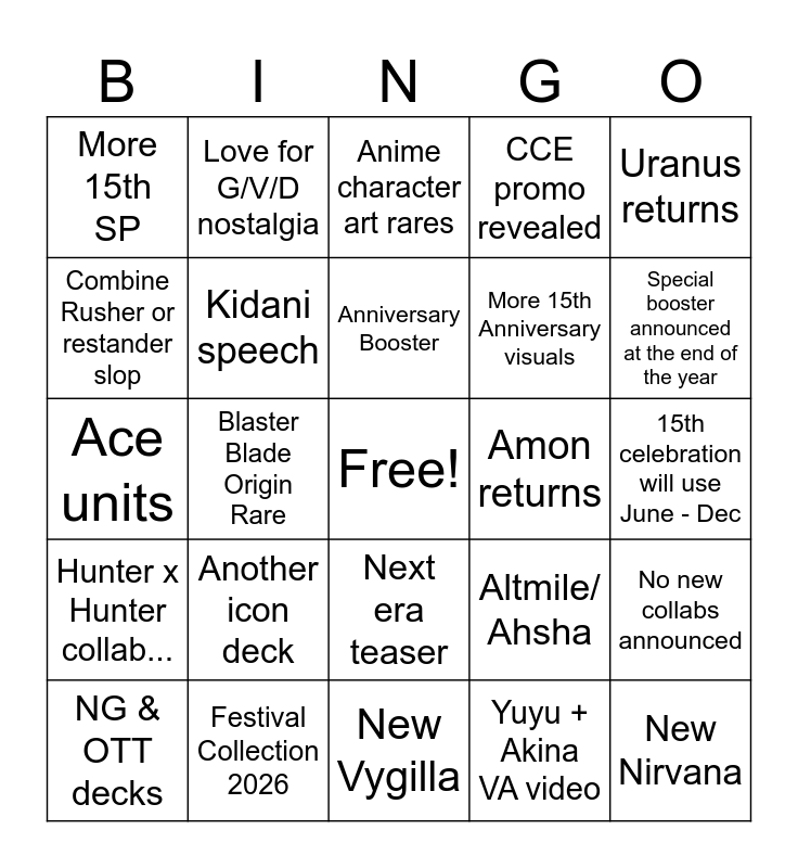 This bingo card has a free space and 24 words: Another icon deck, Festival Collection 2026, Anniversary Booster, NG & OTT decks, Uranus returns, More 15th SP, Combine Rusher or restander slop, Love for G/V/D nostalgia, Amon returns, Next era teaser, More 15th Anniversary visuals, Ace units, Altmile/ Ahsha, No new collabs announced, Kidani speech, Yuyu + Akina VA video, 15th celebration will use June - Dec, Anime character art rares, Special booster announced at the end of the year, Blaster Blade Origin Rare, New Nirvana, Hunter x Hunter collab..., CCE promo revealed and New Vygilla.