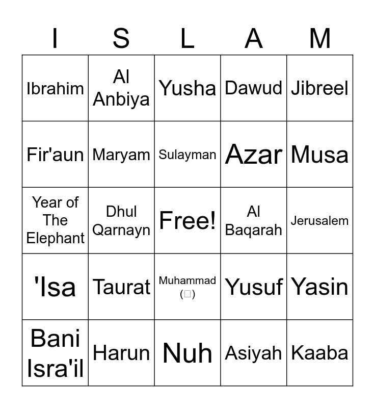 This bingo card has a free space and 29 words: Bani Isra'il, Quran, Dhul Qarnayn, Makkah, Ibrahim, Yusha, Maryam, Taurat, Al Baqarah, Harun, Jerusalem, Kaaba, Nuh, Asiyah, Musa, Isma'il, Muhammad (ﷺ), 'Isa, Jibreel, Year of The Elephant, Yusuf, Injeel, Azar, Fir'aun, Dawud, Al Anbiya, Yasin, Sulayman and Al Maidah.