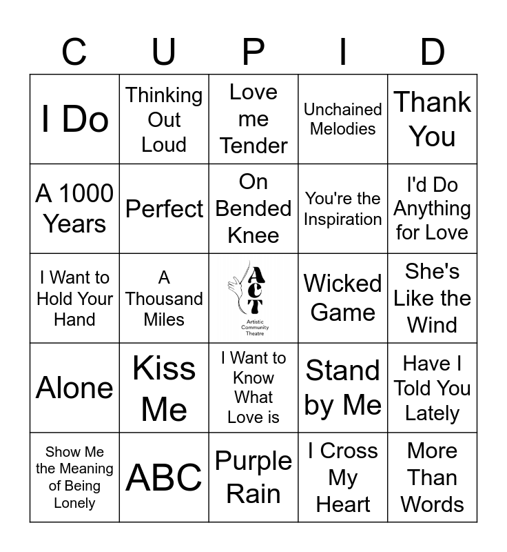 This bingo card has a free space and 75 words: Lost in Love, Mandy, Love me Tender, Hello Darlin', Islands in the Stream, Lady, Right Here Waiting, Ever the Same, Heaven, Love of a Lifetime, Always, Iris, On Bended Knee, A 1000 Years, All of Me, A Thousand Miles, Truly Madly Deeply, More Than Words, I Swear, Thank You, Nothing's Gonna Stop Us, I Want to Hold Your Hand, Perfect, Thinking Out Loud, Unchained Melodies, Hello, Everything I do, The Power of Love, At Last, My Girl, Be My Baby, Moon River, Strangers in the Night, Stand by Me, I'd Do Anything for Love, You're the Inspiration, Angel Eyes, Hungry Eyes, She's Like the Wind, I Cross My Heart, Kiss on My List, How Do I Live, I Will Always Love You, Endless Love, When I See You Smile, Don't Know Much, Show Me the Meaning of Being Lonely, I Do, My Immortal, Crimson and Clover, Angel, I Want to Know What Love is, I'll Stand by You, Glory of Love, It Must Have Been Love, Faithfully, Can't Fight this Feeling, Crazy for You, Nothing Compares to You, Take on Me, Kiss Me, Eternal Flame, The Lady in Red, In Your Eyes, Crash into Me, Wicked Game, Time after Time, Take My Breathe Away, Time of My Life, Have I Told You Lately, Alone, ABC, Everything, Purple Rain and You are the One I Want.