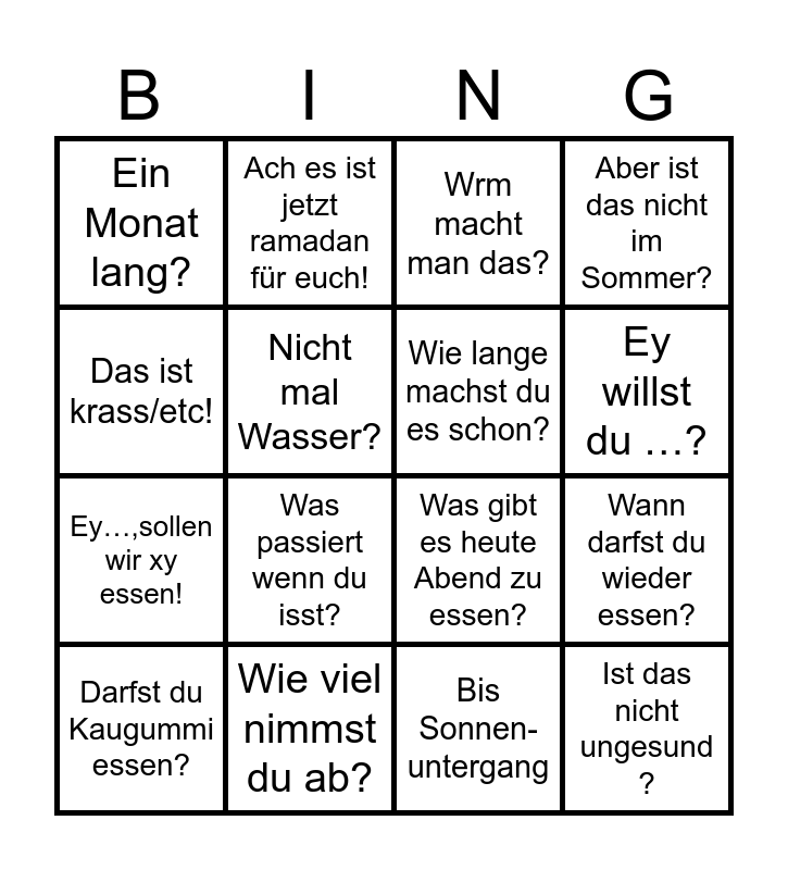 This bingo card has 16 words: Darfst du Kaugummi essen?, Wie viel nimmst du ab?, Wrm macht man das?, Aber ist das nicht im Sommer?, Das ist krass/etc!, Ach es ist jetzt ramadan für euch!, Was gibt es heute Abend zu essen?, Wann darfst du wieder essen?, Ein Monat lang?, Nicht mal Wasser?, Bis Sonnen- untergang, Ey willst du …?, Ey…,sollen wir xy essen!, Was passiert wenn du isst?, Wie lange machst du es schon? and Ist das nicht ungesund ?.