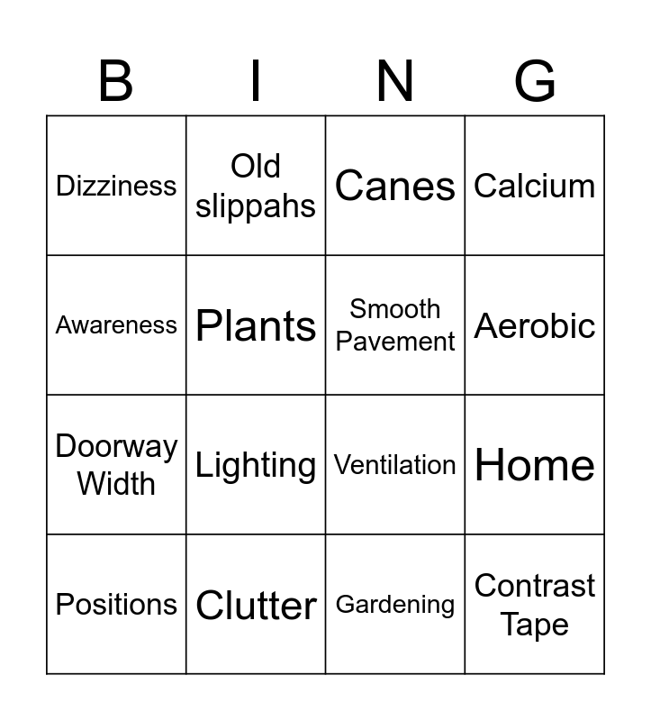 This bingo card has 27 words: Free!, Balanced diet, Doorway Width, Rushing, Plants, Canes, Old slippahs, Contrast Tape, Clutter, Costly, Ventilation, Calcium, Sturdy, Rug, Lighting, Side effects, Smooth Pavement, Aerobic, Grab bars, Dizziness, Gardening, Extension Chords, Home, Positions, Handrails, Awareness and Appliance.