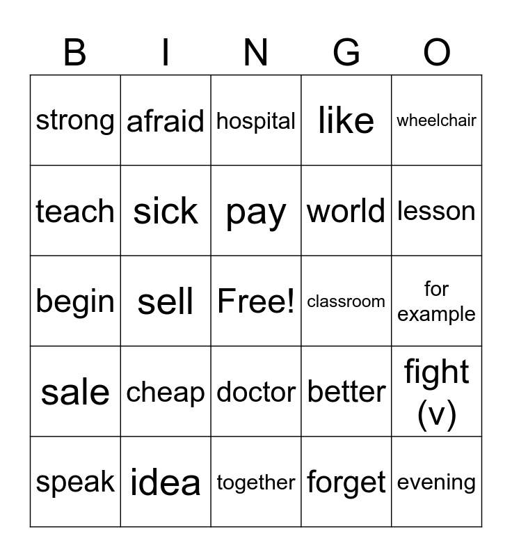 This bingo card has a free space and 24 words: cheap, idea, pay, speak, wheelchair, strong, teach, afraid, classroom, doctor, world, begin, better, fight (v), sick, forget, for example, hospital, lesson, sell, evening, sale, like and together.