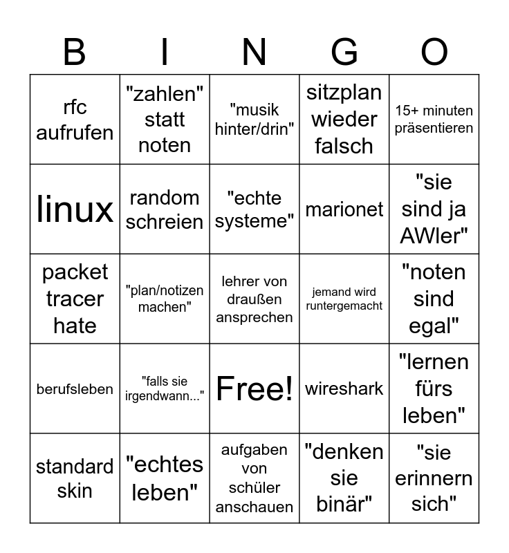 This bingo card has 26 words: Free!, "denken sie binär", "echte systeme", "echtes leben", 15+ minuten präsentieren, rfc aufrufen, linux, "zahlen" statt noten, "noten sind egal", wireshark, marionet, packet tracer hate, "lernen fürs leben", standard skin, "plan/notizen machen", jonas matej verwechseln, sitzplan wieder falsch, berufsleben, "musik hinter/drin", lehrer von draußen ansprechen, "sie sind ja AWler", aufgaben von schüler anschauen, jemand wird runtergemacht, "falls sie irgendwann...", random schreien and "sie erinnern sich".